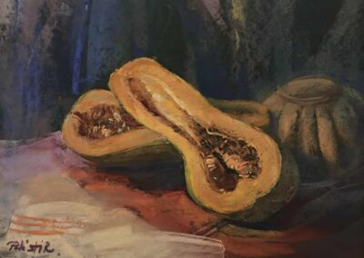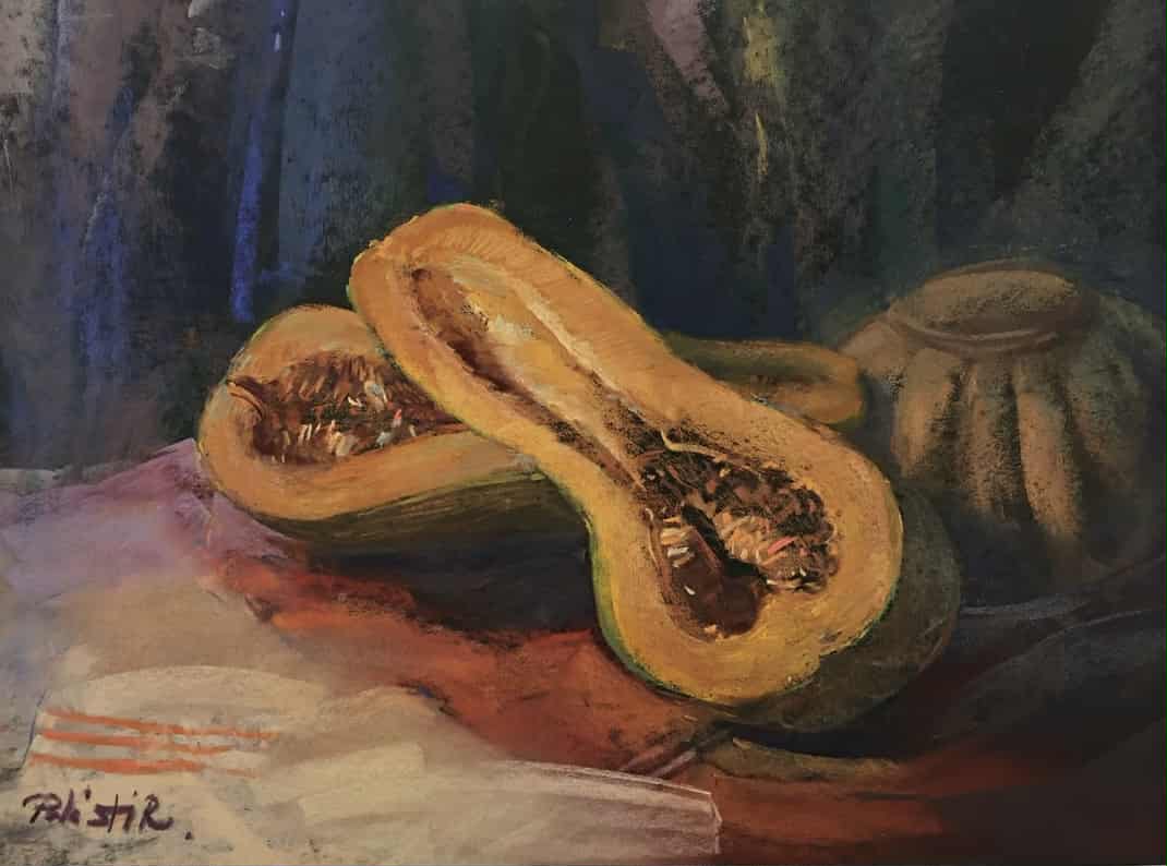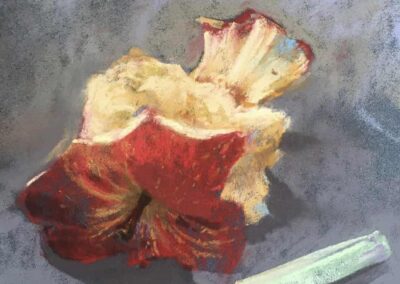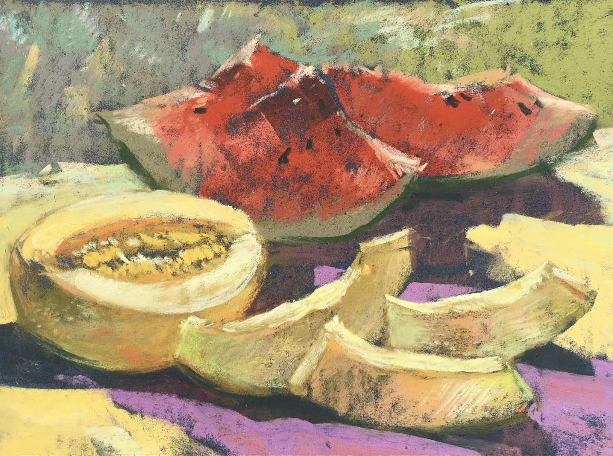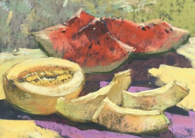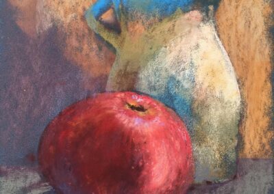 Másnap délelőtt az önárnyék, a vetett árnyék és a környezet színezetének megjelenítése lesz a téma egy gyümölcsön vagy zöldségen. Sorra kerül a gyümölcsök szeletelése, csonkolása, és a beállítás előkészítése is, valamint Reni megtanítja nektek a csendélet kompozíciós szabályait. Vasárnap délután színvázlat készítése lesz beállításról, vagy hozott témáról. Tanulmányozzuk a tömegek felhelyezését, az irányultságokat, és végül megtörténik a csendélet festése pasztellel.