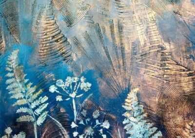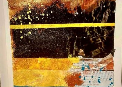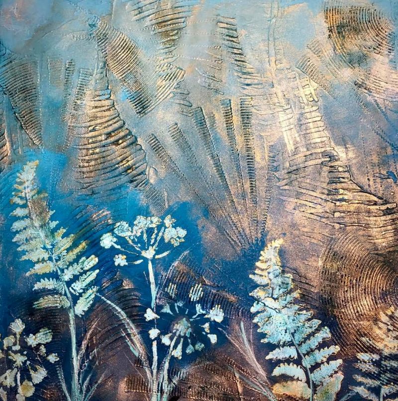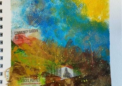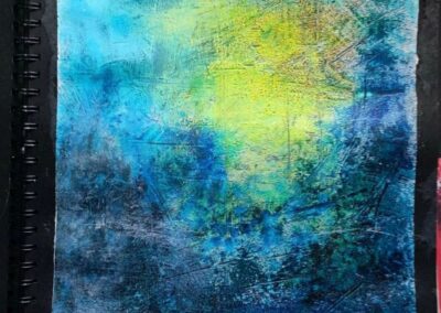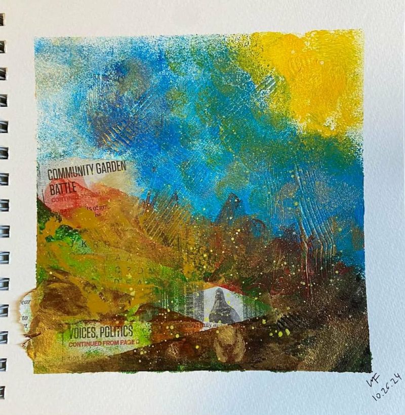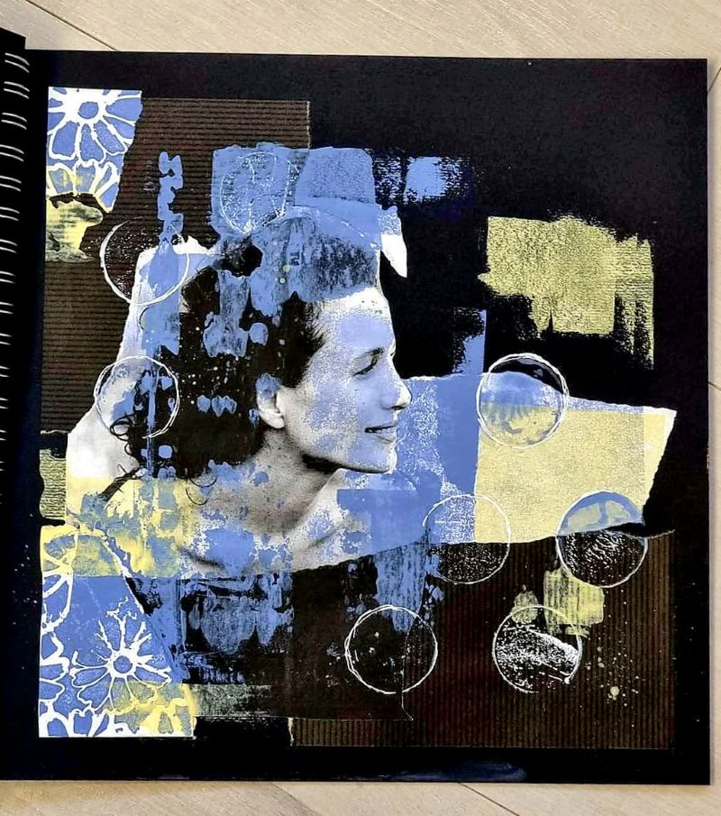 “Az elmúlt 12 hét eseménydús volt! Kezdtünk egy kollázzsal majd belehúztunk. Házilag készítettünk többféle szemcseméretű, finomságú struktúrpasztát és ezekkel változatos felületeket. Kollázsoltunk papírral és textillel meglepő struktúrákat, hatásokat kísérleteztünk ki az oldalakon. Festettünk növényi részekkel és viasszal, szivaccsal és plasztikkártyával. Mintáztunk faerezővel és fugaformázókkal. Nyomdáztunk mindennel, amit a fürdőszobában és a konyhában felleltünk, hogy csodás kollázspapírokat készítsünk. Tanultunk kompozícióról, kontrasztról, színelméletről és festési technikákról. Aranyoztunk sokat és egy picit akvarelleztünk. A kísérletek tapasztalatait néhány tájképnél is felhasználtam.“