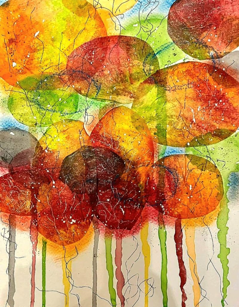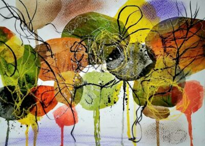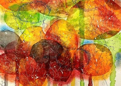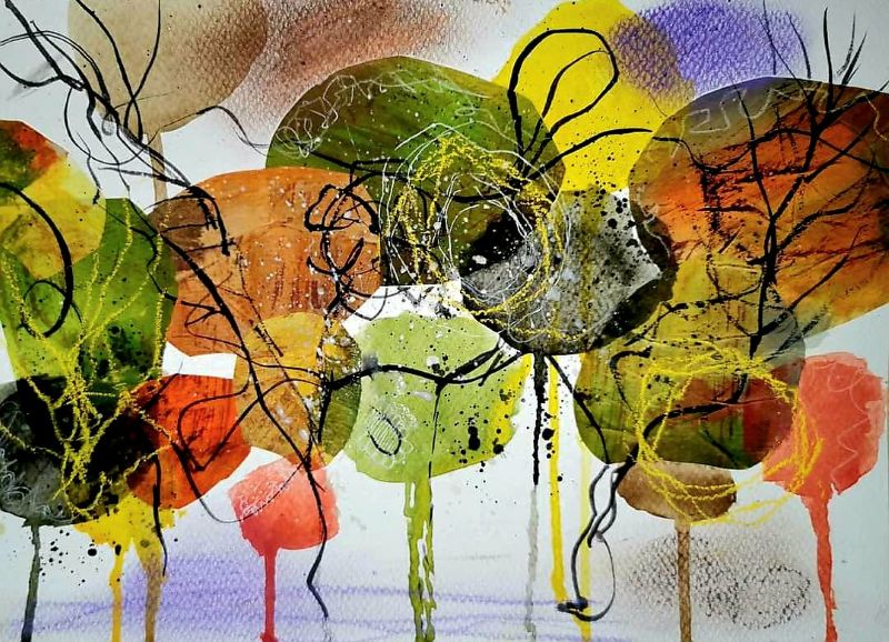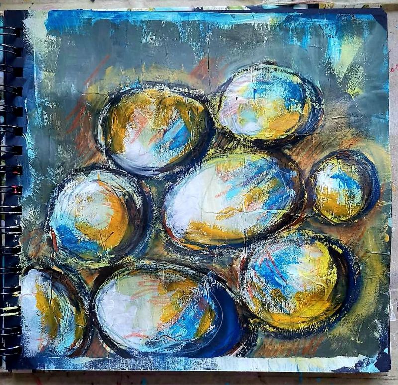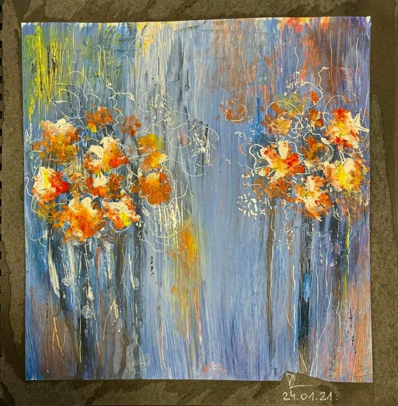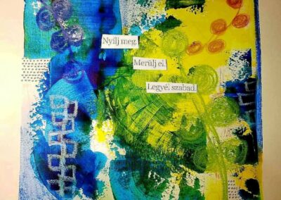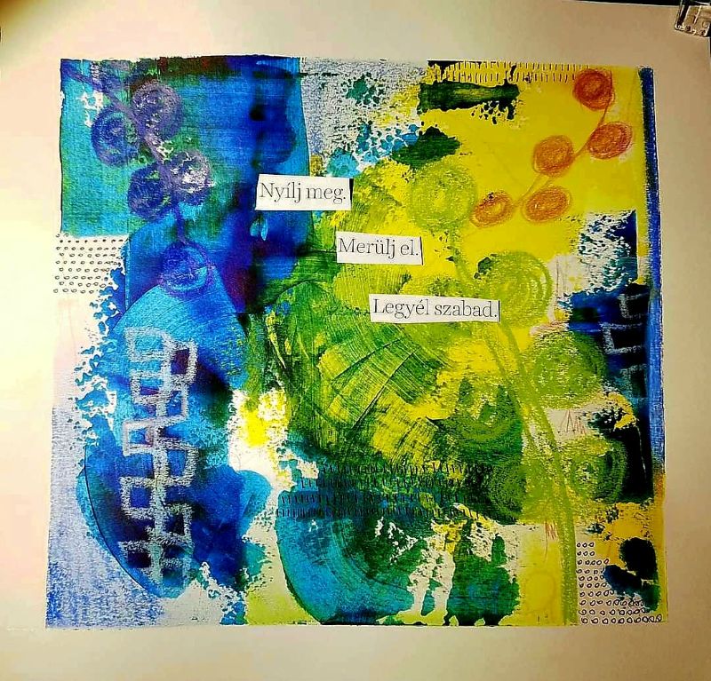 Eddig az akvarellezés volt az én világom. De mivel szeretek új dolgokat tanulni, Tinánál próbáltam már az absztrakt festést, illetve a vegyes technikás alkotást. A 12 hetes online program során beszippantott ez a műfaj is… Lakásfestés miatt kimaradt néhány alkalom, de utána 2 egész ‘Tina-napot’ tartottam, hogy pótoljak. :-)) Ezért, és a fizikai távolság miatt szeretem az online kurzusokat. Bátran ajánlom annak, aki technikai ismeretekre vágyik és gyakorolná az önkifejezést!